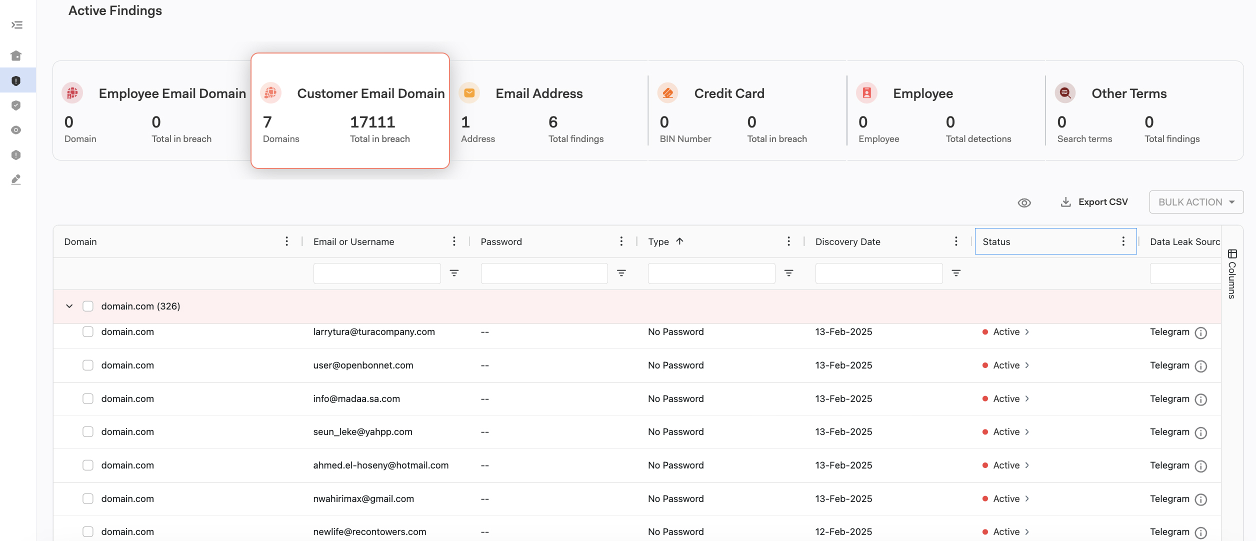 - Search, filter (and save filters), perform bulk actions, and export findings to CSV from this screen.